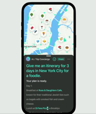ユーザーは、同サービスを利用することで、テキストのみならず、ソーシャルメディア投稿、ブログ等から旅行のインスピレーションを得た素材を貼り付けることができ、アプリはこれらに基づいて旅程を提案します。これにより、ユーザーはシームレスで心地の良い顧客体験を享受できます。また、同社が長年蓄積してきた数億の豊富なデータ資源をバックエンドで回答と紐づけることで、旅程のみならず、店舗名・営業時間・場所・写真・レビュー等の最新の情報を併せてユーザーに提示します。