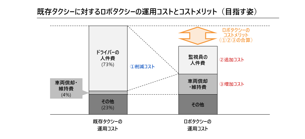 ロボタクシーはドライバー費用が不要であるため、大幅にコストを下げられるメリットがあります。しかし現在は、監視員の人件費や高額な自動運転車の導入費用がかかるため、このメリットを十分に享受できていません。