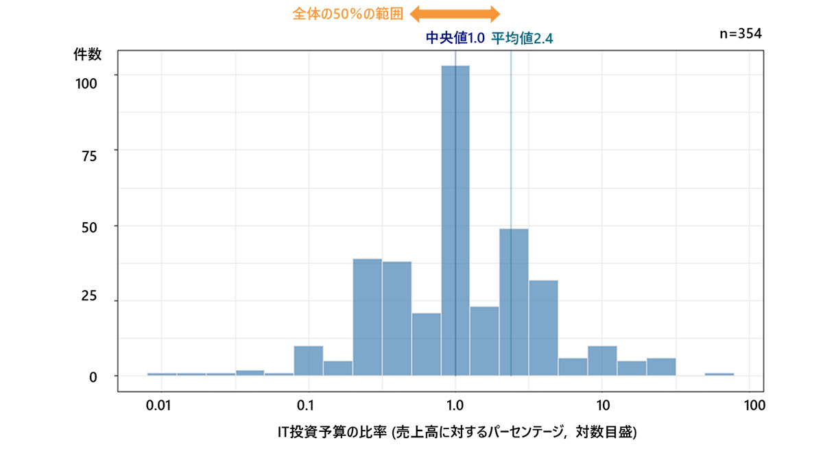 横軸は、IT投資予算の対売上高比率を表しており、右側にいくほどIT投資予算の比率が高い企業、左側にいくほど低い企業となります。縦軸は回答の件数を表しています。横軸は対数軸を用いており、低い値ほど分類が細かくなるように工夫しています。