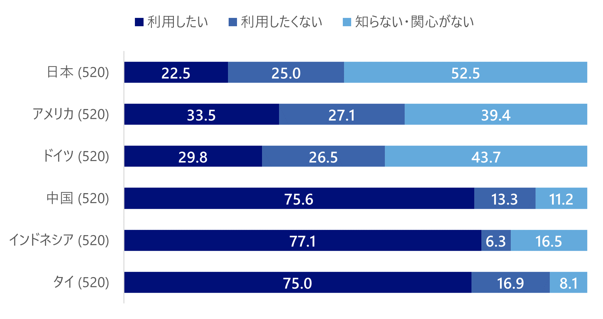 その結果、日本、アメリカ、ドイツでは「利用したい」と回答した人の割合は4割未満でしたが、中国、インドネシア、タイでは7割以上となり、先進国と新興国で大きな差があることがわかりました(図1)。