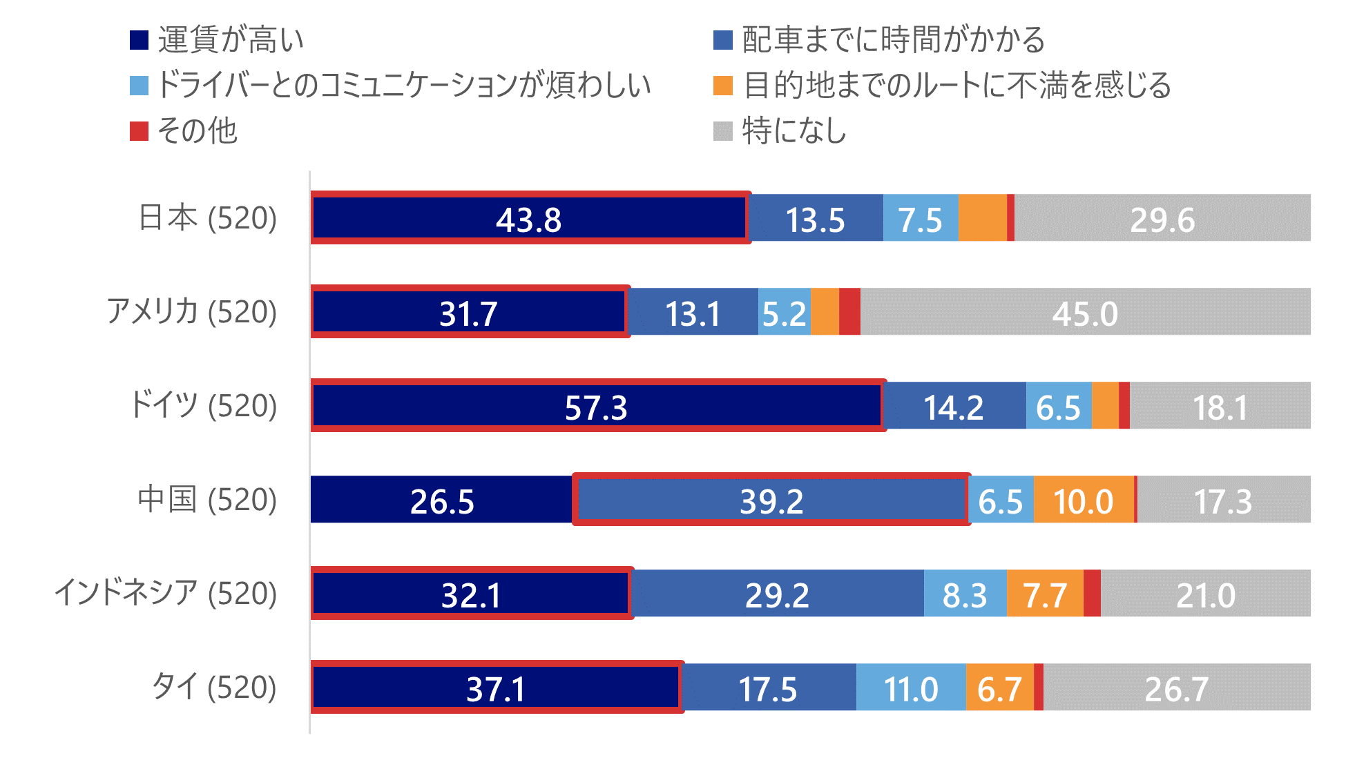 その結果、中国を除く5か国で「運賃が高い」と回答した人が最も多く、不満の高さが明らかになりました(図5)。また、中国では「配車時間までの時間」についての不満が最も多く、他の国でも運賃の高さに次いで2番目に多い不満点となりました。