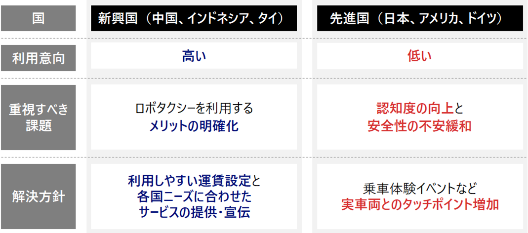 このように、ロボタクシーサービスの普及に向けては、消費者の利用意向に応じた課題や各国ニーズを踏まえた戦略が必要です。