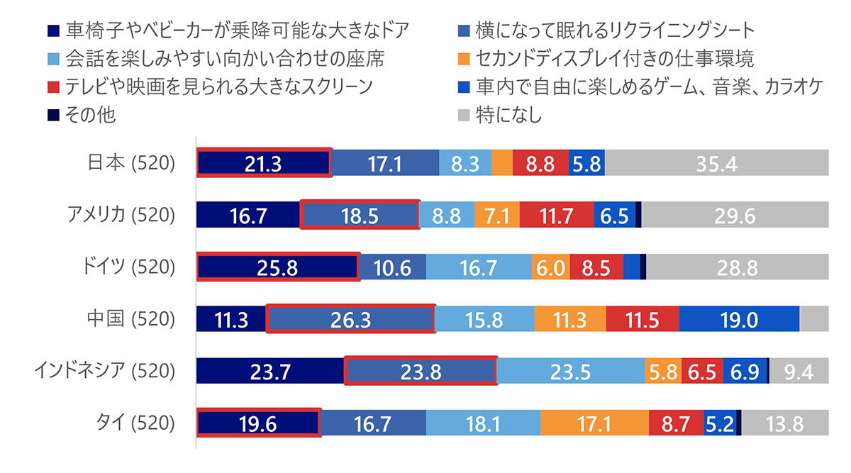 その結果、ロボタクシーサービスに対するニーズは各国で異なることがわかりました(図6)。具体的には、日本、ドイツ、タイでは「車椅子やベビーカーが乗降可能な大きなドア」が、アメリカ、中国、インドネシアでは「横になって眠れるリクライニングシート」がトップ回答となりました。