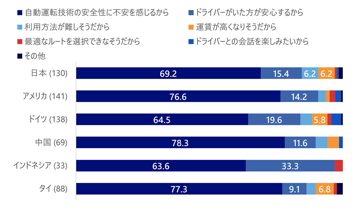 ロボタクシーサービスを利用したくないと回答した人に対して、その理由を尋ねたところ、すべての国で「自動運転技術の安全性に不安を感じるから」という回答が最も多く、全体の6~8割を占めました(図3)。