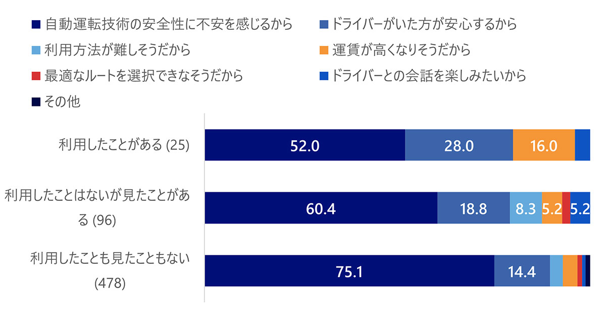 ロボタクシーの利用経験が安全性への不安感にどのような影響を及ぼすかを確かめるために、ロボタクシーサービスを「利用したくない」と答えた人が挙げた理由を分析しました。