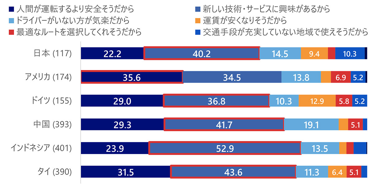 ロボタクシーサービスを利用したい理由についての調査では、「新しい技術・サービスに興味があるから」という回答が、アメリカを除く5か国ではトップ、アメリカでは2番目に多い回答となりました(図2)。この結果から、消費者はロボタクシーの先進性に魅力を感じているということがわかりました。