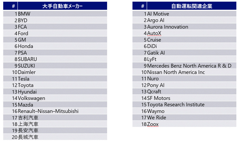 調査対象は、世界の自動車販売台数上位20社の大手自動車メーカーと、カリフォルニア州における自動運転走行距離上位18社の自動運転関連企業としました。特許の出願地域はアメリカ、欧州、中国とし、期間は2018年から2022年までを対象としました。