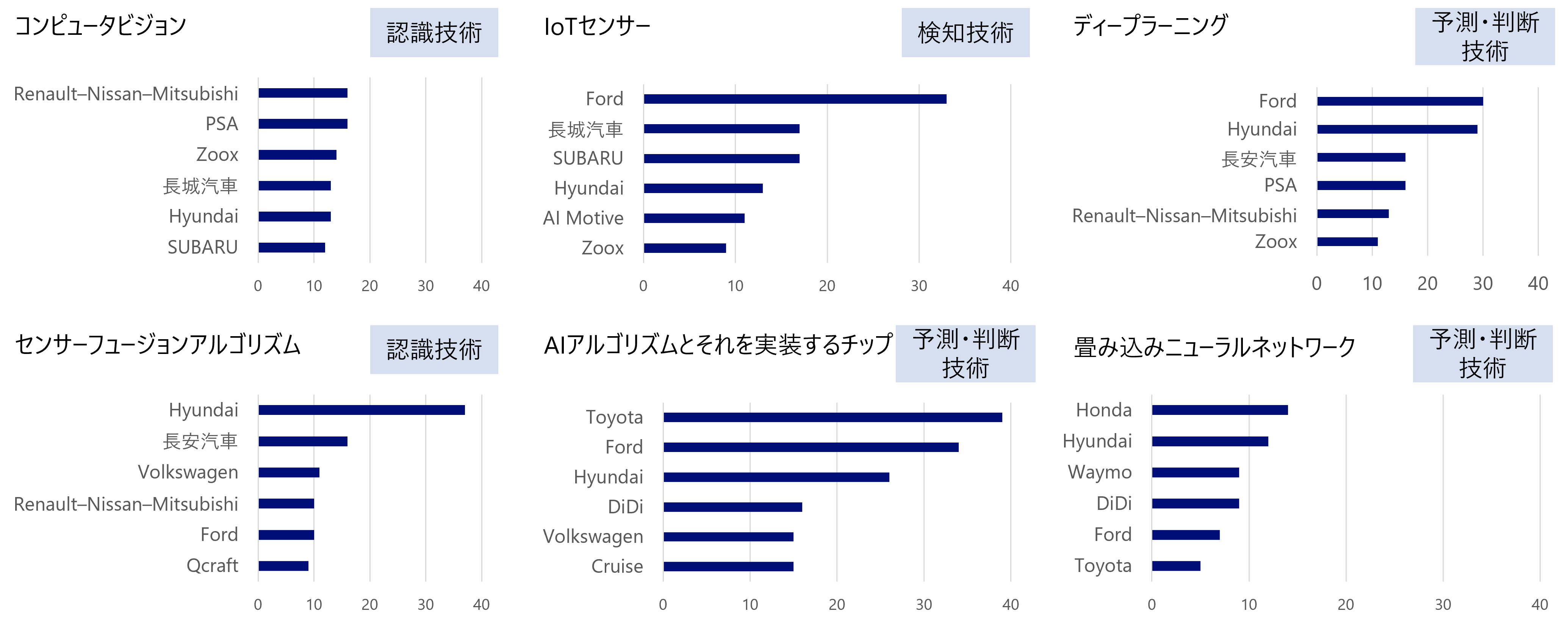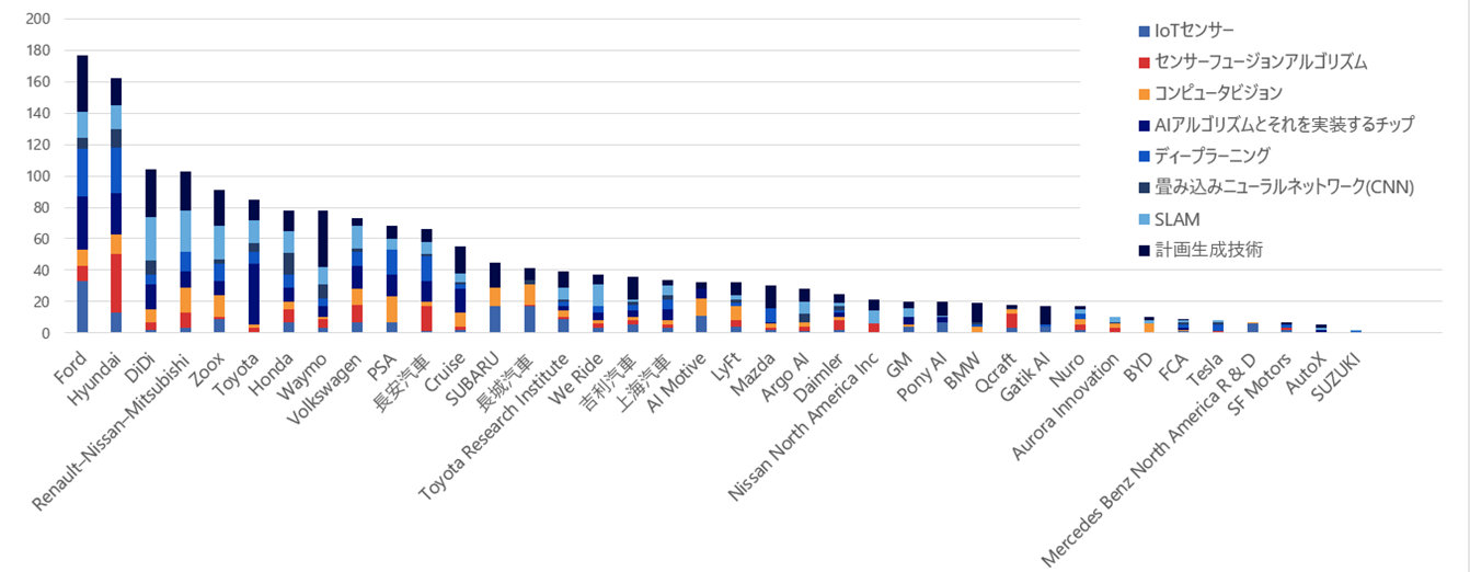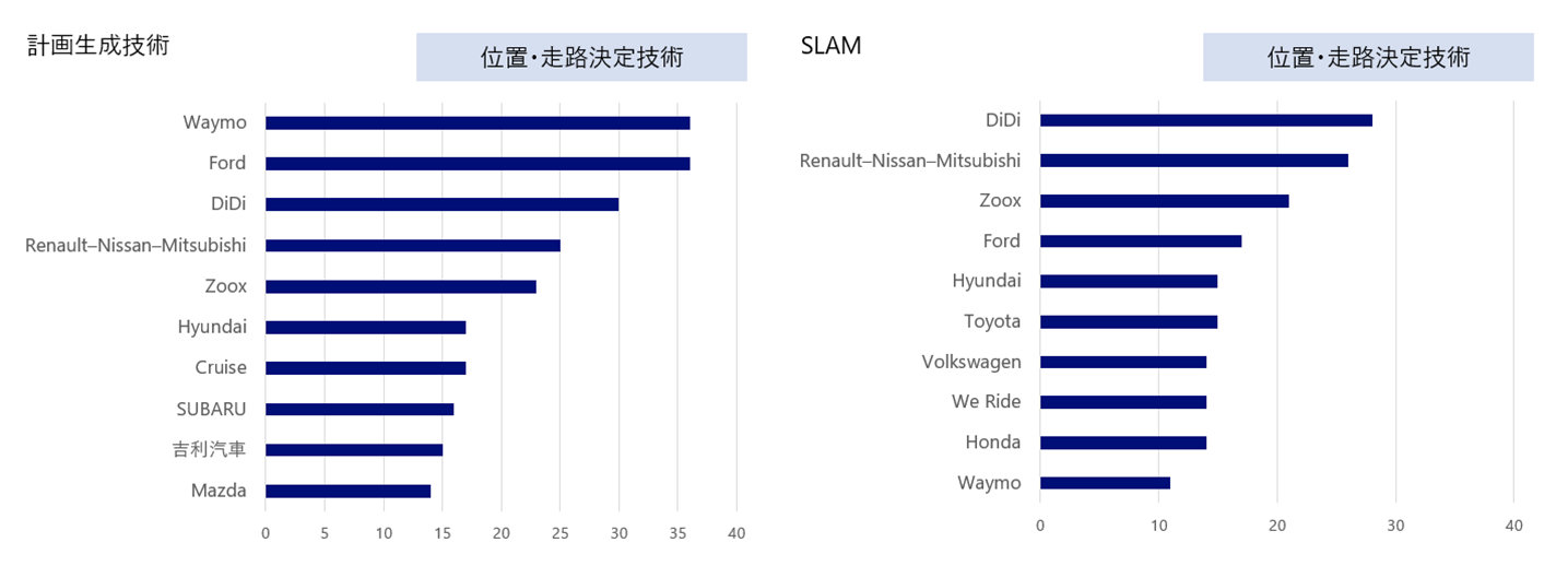 計画生成技術ではWaymo 、SLAMではDiDiといったように、新興の自動運転関連企業がトップを占めています。これらの技術は実際の路上での走行データや道路状況を加味した実験を進めることが技術開発に有効であると考えられます。そのため、ロボタクシー事業で先行する新興の自動運転関連企業は、豊富な走行データや路上実験を武器に技術開発を進めていると推測できます。