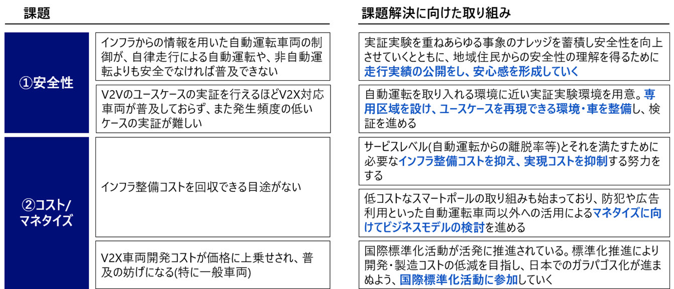 V2Xの普及に向けては、インフラ整備に関するコストとマネタイズ、および安全性という2つの課題を解決する必要があります。これらの課題に取り組むことが、V2X技術の実用化と普及に向けた重要なステップとなり、自動運転技術の発展につながるでしょう。