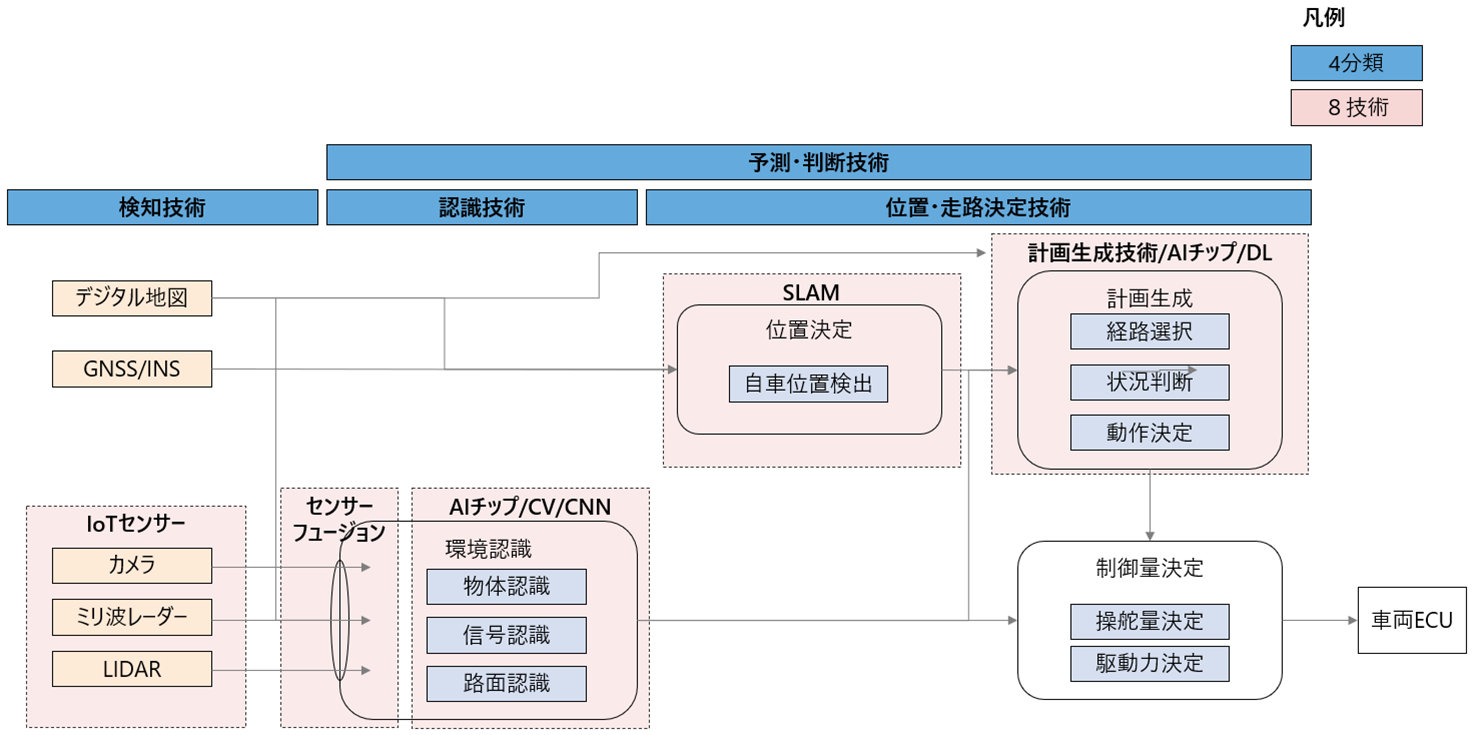 各種公開情報をもとに、自動運転レベル4で重要となる技術要素を4分類、8技術に独自設定しました。