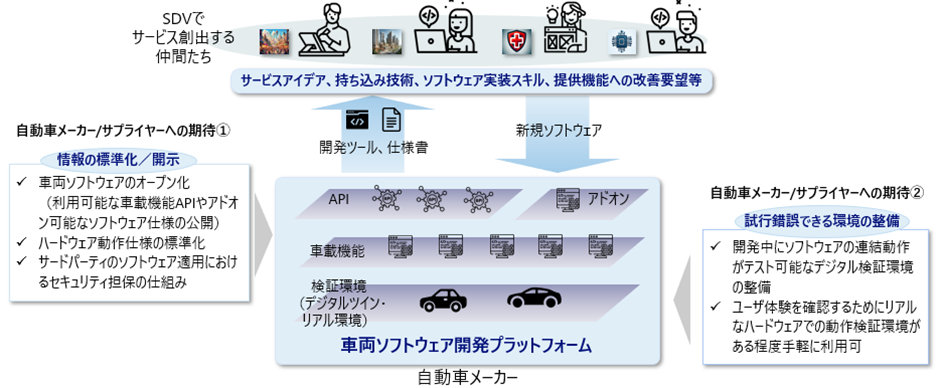 自動車業界と異業種とが手を取り合って実際に活動するためには、クルマが提供できる機能の詳細情報や、実際にソフトウェアを実装して試す環境を整えることで、連携のハードルを下げることがポイントです。「クルマが持つ情報のオープン化」と「検証環境の充実」により、新たなユースケースやサービスアイデアに対して迅速なプロトタイピングと実装が促され、イノベーションのサイクルが加速されることでしょう。