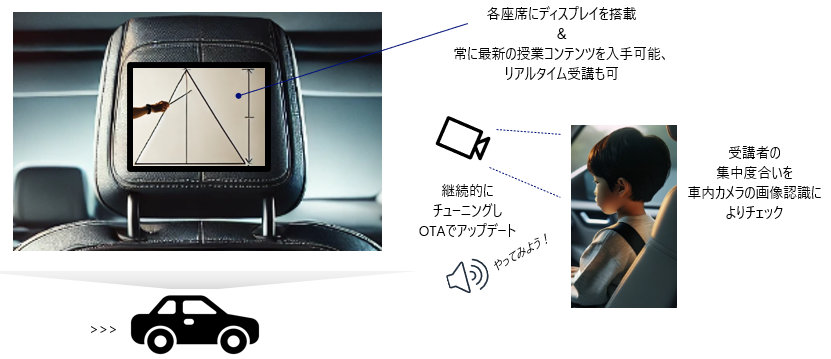 例えば、クルマは、学習のための空間として利用することも可能です。図2に示すように、高速な通信環境を通じて常に最新の授業コンテンツを入手でき、車内カメラの画像によって受講者の集中度合いをチェックできる可能性もあります。顔画像の判定や感情認識の技術が高精度し、学習コンテンツや音響、空調も受講者がより集中できるようにチューニングされます。また、OTAによってこれらの機能が継続的にアップデートされ、受講者が効果的に学習するための改善が行われます。