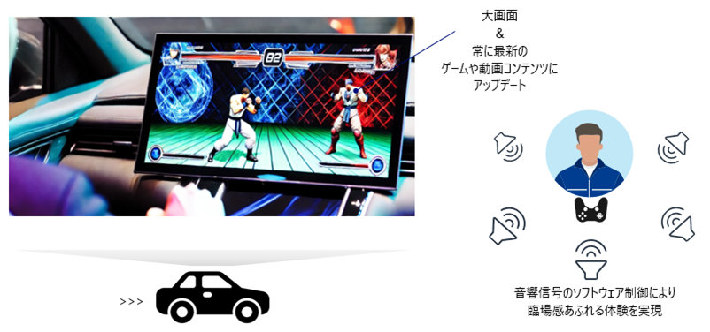 従来のクルマにおいても、車内のスピーカーなどのAV機器による音楽再生は、ユーザに快適性や娯楽性を提供していました。しかし、SDVでは高速な通信環境や演算装置を組み込むことで、リッチなコンテンツを扱えるようになります。音響面では、ソフトウェア制御による立体音響やノイズキャンセリングなどが可能となり、視聴覚に訴える高度な車内体験を提供すると考えられます。