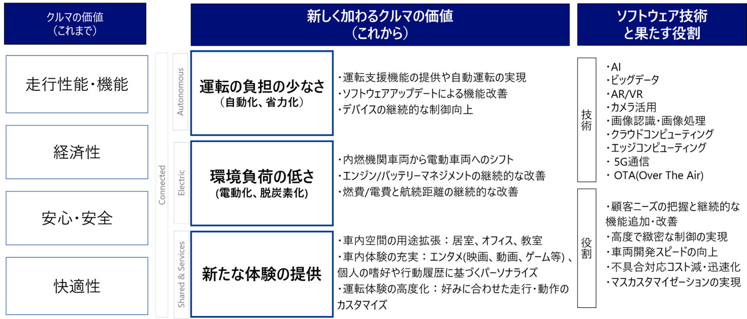 従来、クルマではエンジンの出力や装備といった走行性能・機能、車両価格、燃費・電費といった購入時・利用時の経済性、衝突回避などの安心・安全、そして走りの爽快さや室内の広さといった快適性が価値として重視されてきました(図1左側)。