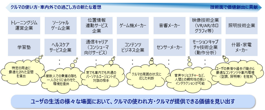 SDVでは環境の変化や技術の進化に応じた、新たな体験・新しい価値の提供が必要です。そのためには、クルマの新しい利用方法を考案し、提案していくことが避けて通れません。ユーザ起点で、生活シーンの中でのどのようにクルマが使われるかを考えることが重要です。このような検討においては、自動車メーカーの知見や経験だけでは発想が限られてしまうでしょう。