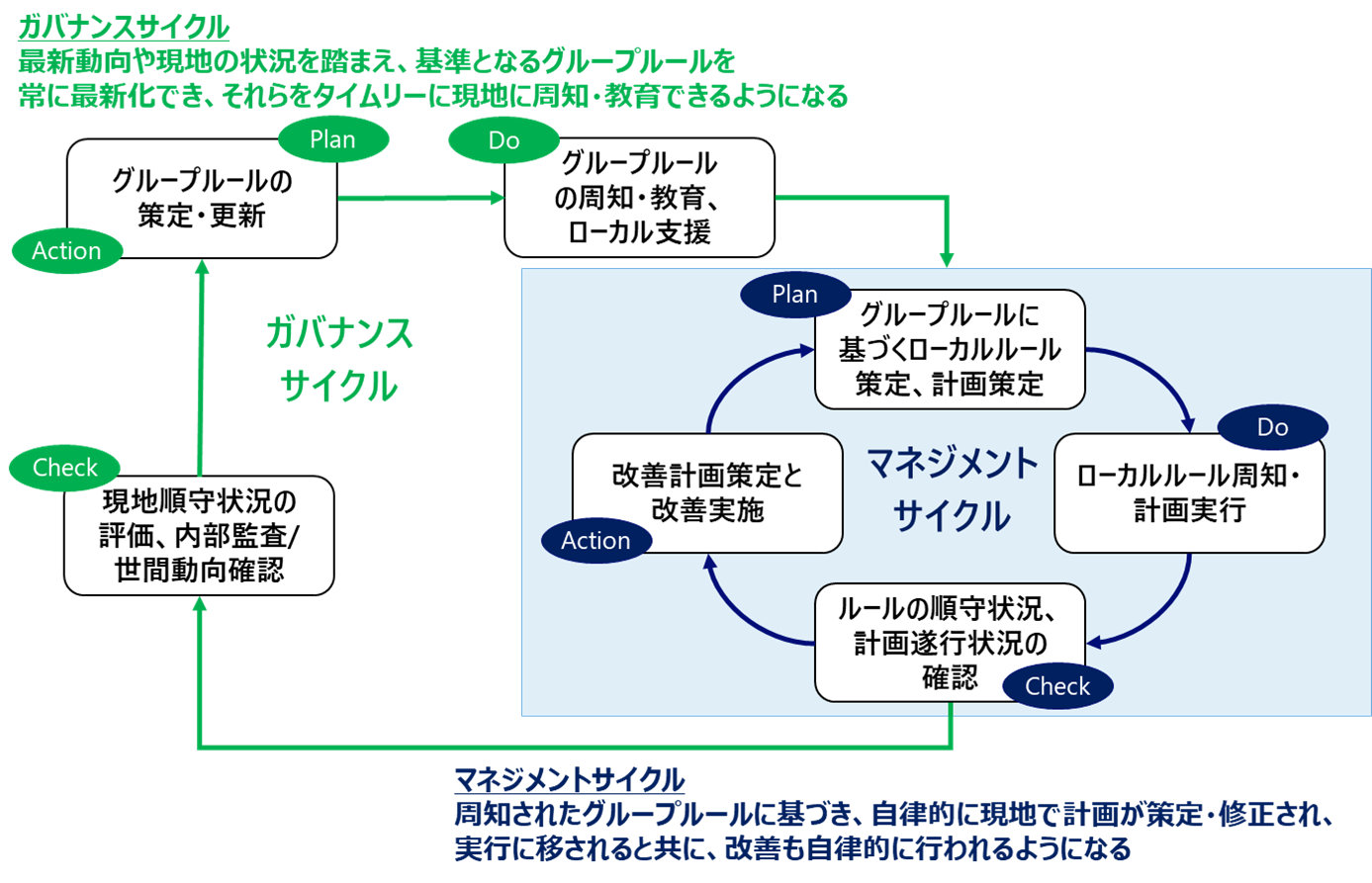 セキュリティガバナンスの最終的な目指す姿は、ガバナンスサイクルとマネジメントサイクルがグループ全体で有機的に機能することです。これら2つのサイクルがそれぞれのPDCAサイクルとして定義され、組織は環境の変化に適応しながら、相互に関連し合い、継続的な改善を実現することを目標とします。