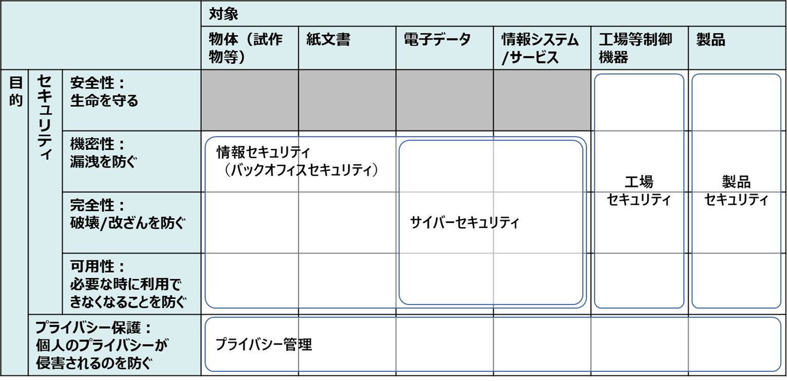 セキュリティの場合、「目的」と「対象」をクロスマトリクスで検討すると分かりやすいでしょう。例えば、「目的」を「安全性の確保」「機密性の確保」「可用性の確保」「完全性の確保」「プライバシー保護」とし、「対象」を守るべき「情報資産」として、それらを掛け合わせてマトリクスを作成することで、セキュリティガバナンスを導入するスコープを整理できます。以下に、整理用マトリクスの例を提示します。「情報セキュリティ」、「サイバーセキュリティ」、「プライバシー管理」などのスコープ候補を明示した上で、どこまでをCIOのセキュリティガバナンスのスコープとするかを検討していきます。