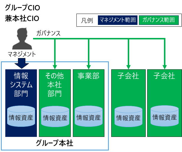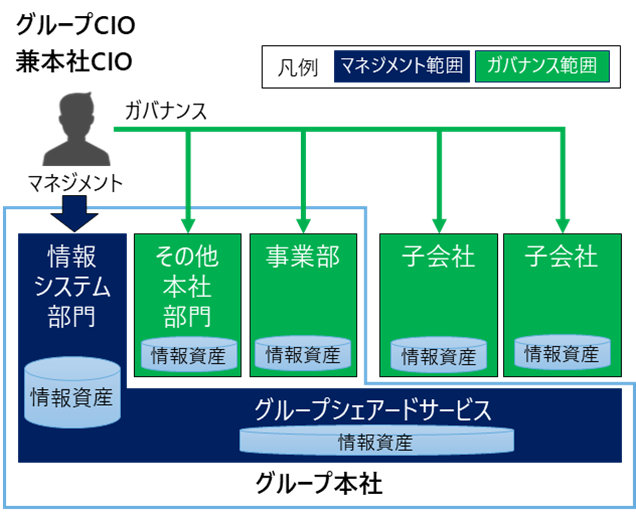 また、もしグループ全体でシェアードサービスとしてネットワークやサーバ群を共有しており、それをグループCIOが直接管理する場合は、グループネットワーク・サーバ群は「マネジメント」対象となります。集合調達でパソコンなどIT機器を一括で調達しキッティングしている場合や、ログを統合管理している場合も、同様にその部分は「マネジメント」範囲となり「ガバナンス」対象から外れます。(図表3-2)