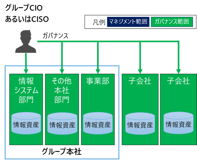 今回は、グループ・グローバルのセキュリティガバナンスを、グループCIOを兼務する本社CIOが導入する前提としますので、主語はグループCIO兼本社CIOです。そして、本社CIO直下の資産は、「マネジメント」対象となり、「ガバナンス」の対象からは外れます。あえて間接管理である「ガバナンス」の方法を考える必要がないためです。それ以外、本社CIO直下以外の資産(ビジネス部門の資産等)や、グループ会社は「ガバナンス」の対象となります。(図表3-1)