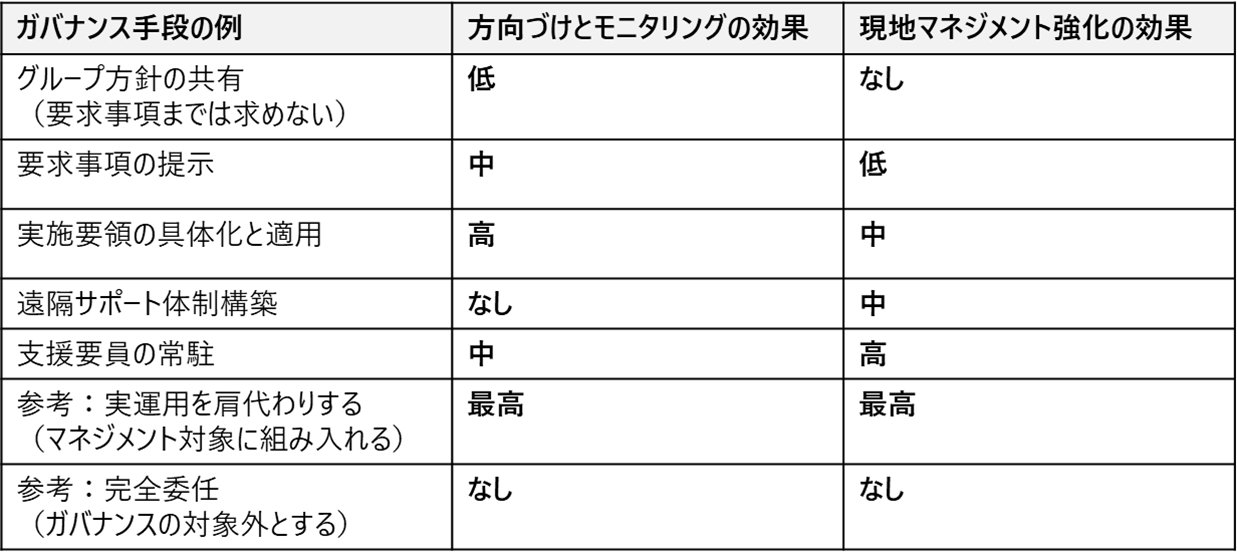 グループ内に、成熟度が高い組織と低い組織が混在している場合、複数パターンを用意することが有効です。成熟度の高いグループ会社では、方針の共有と監査のみで十分な場合もありますが、自立性の低いグループ会社では、手順のひな形を提供し、きめ細やかなモニタリングが必要になります。相手に合わせてガバナンス手段を変える場合、事前に想定するパターンが増えるため、導入準備や運営の負荷が増える可能性があります。ここでもトレードオフが存在するため、多くのパターンを用意すればよいというものではありません。