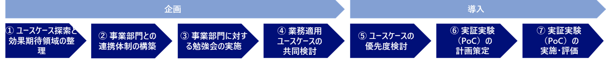 企画フェーズで多くのユースケースを洗い出した後、導入フェーズに移ります。導入フェーズは以下⑤~⑦のプロセスで構成されます。