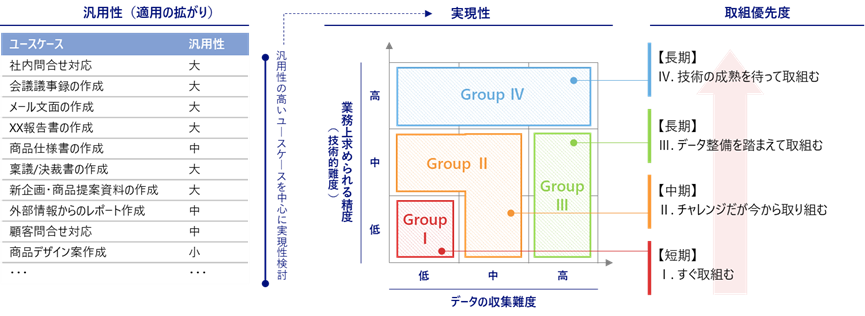 既にこうしたユースケースに取り組んでいる企業で、さらに踏み込んだ検討をしたい場合は、特定の事業や部門の個別業務課題を解決するユースケースに着手することも考えられます。ただし、こうしたケースでは単体でコストに見合った効果を得るのが難しい場合が多いため、他部門にも横展開が可能なユースケースかどうか、汎用性の視点で優先度をつけていくことが重要です。