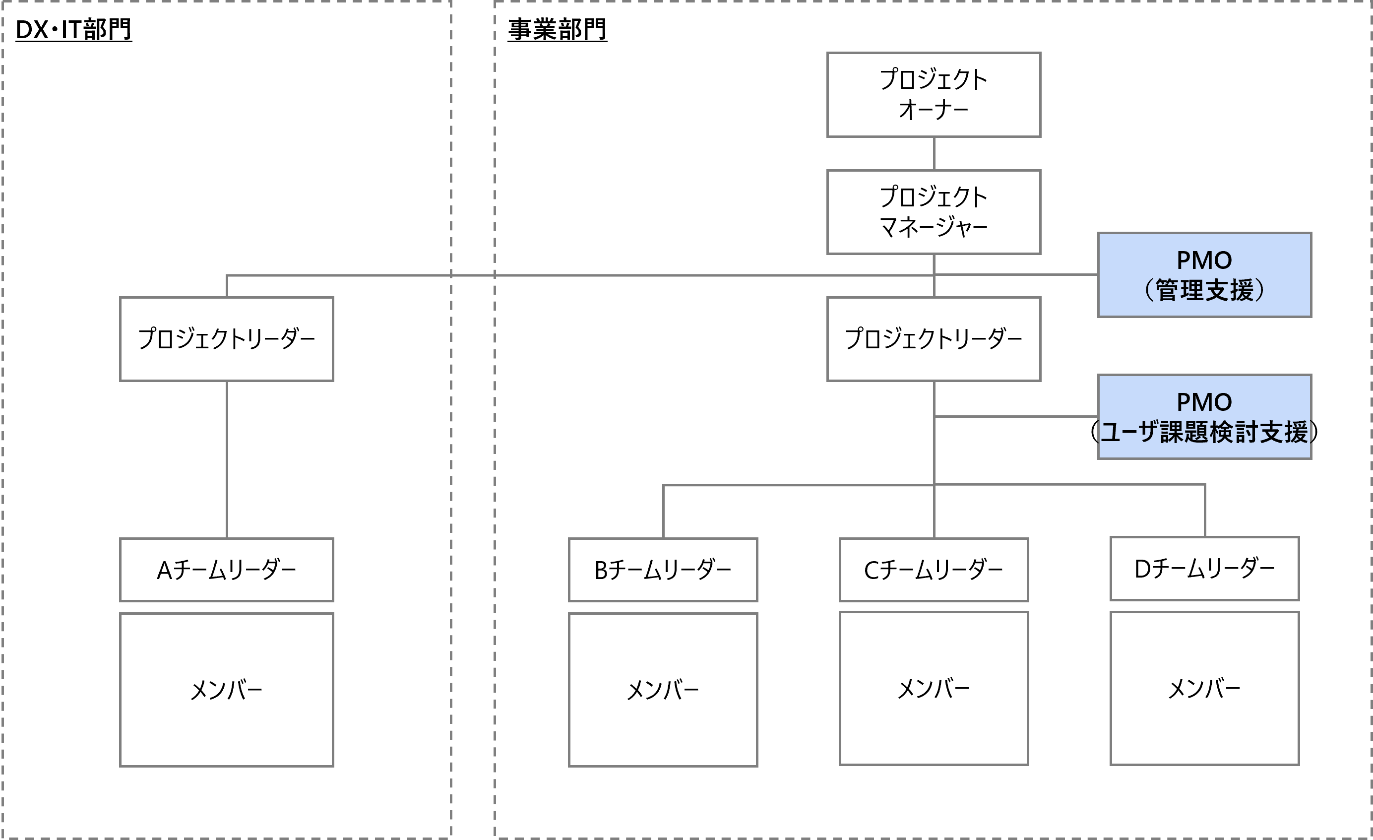 どちらの部門を支援するかによって、PMOの役割は異なります。事業部門・システムユーザーを支援するPMOがシステム開発ベンダーの進捗管理も担っているプロジェクトや、DX・IT部門を支援するPMOが業務要件の仮説出しや事業部門間の調整も担っているプロジェクトは、注意が必要です。