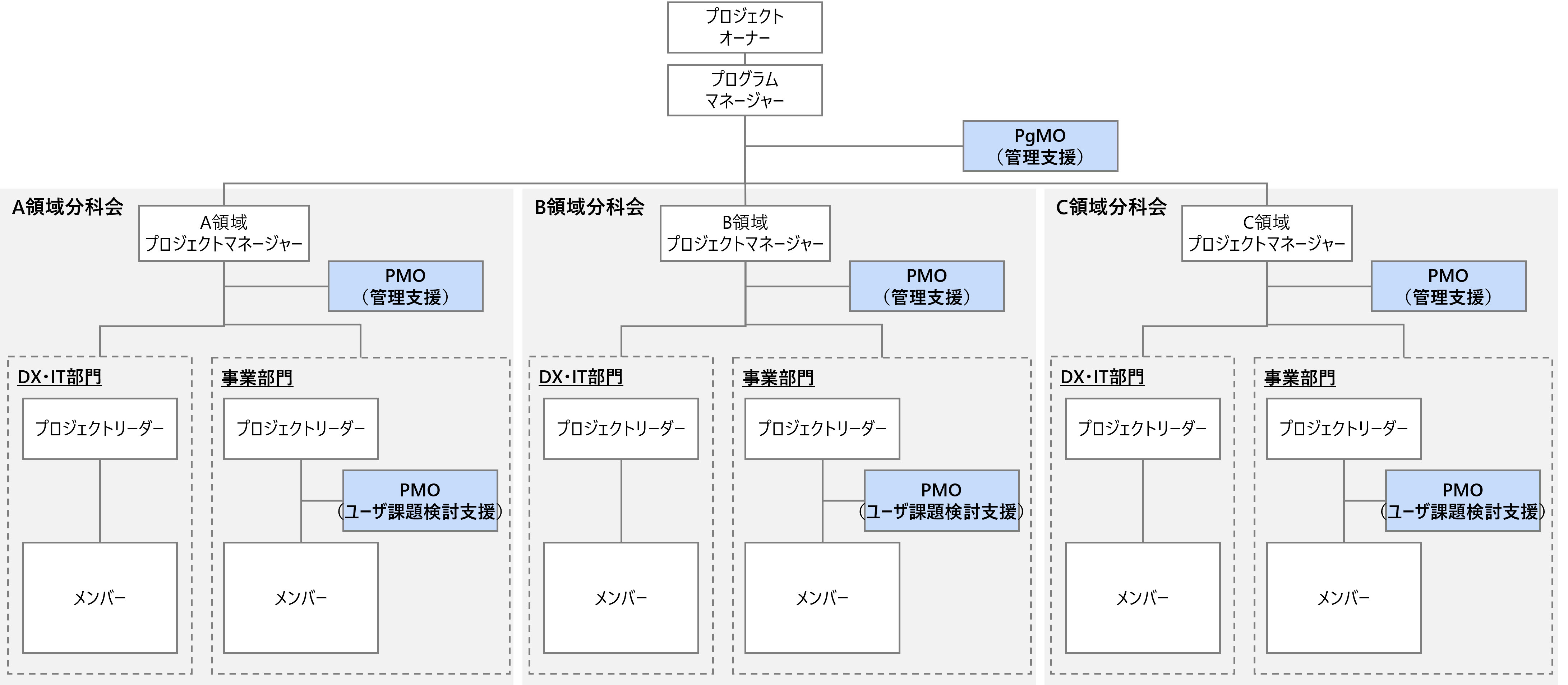 そのため、業務領域単位での段階的なリリースを計画し、まずはA領域のプロジェクトチームが組成されました。管理支援を行うPMOと、ユーザー課題検討支援のチームがそれぞれ配置されました。