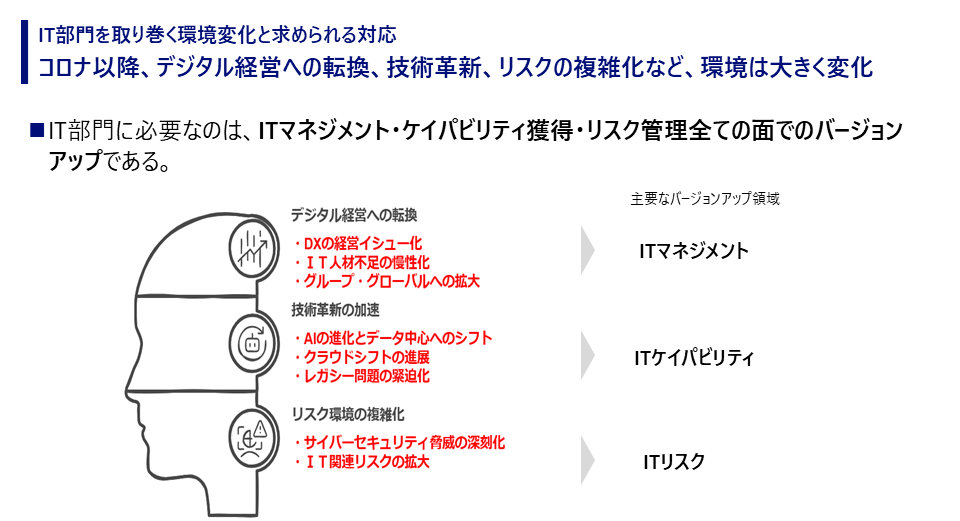 本記事では、そのウェビナー内容から「ITマネジメント」「ITケイパビリティ(実行力)」「リスク管理」の3つの視点で、要点をお届けします。