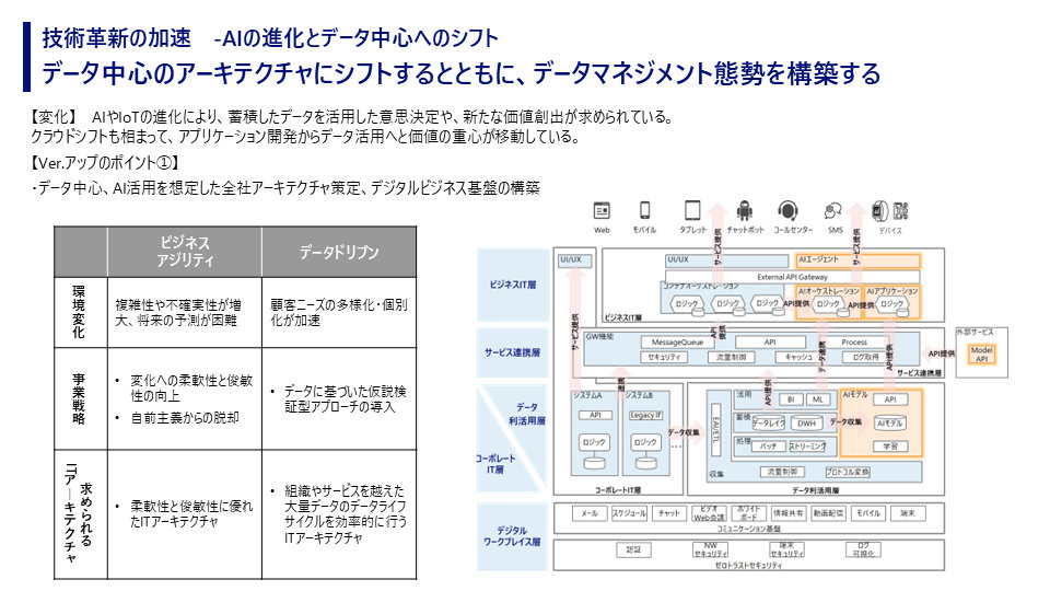 まず注目すべきは、AIやIoTの進化、そしてデータ中心へのシフトです。これに対応するためには、全社としてどのようなアーキテクチャを描き、デジタルビジネス基盤をどう整備するかが重要です。企業全体でデータを活用し、価値を生み出す仕組みを作ることが求められます(図5)。