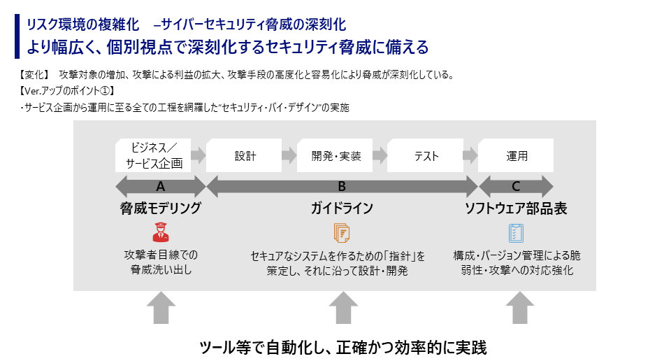 ここで、紹介したいのが、システムを設計する最初の段階からセキュリティを組み込む「セキュリティ・バイ・デザイン」の考え方です。「あとから守る」のではなく、「最初から安全を組み込む」ことが重要であり、サービス企画から運用に至るまでの全ての工程でリスクを意識し、守りを固めていくことが求められます(図6)。
