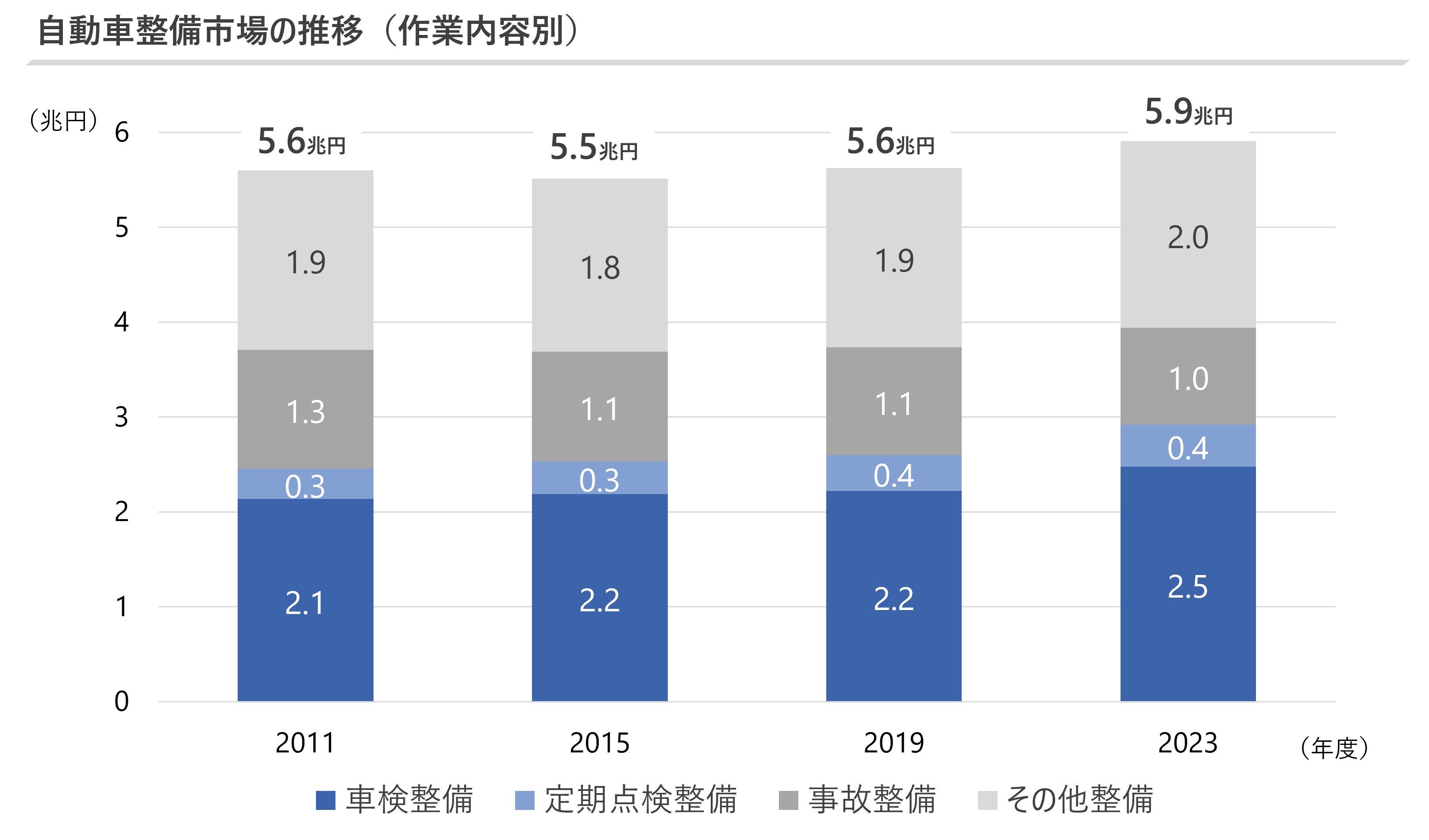 自動車整備市場は長期にわたって安定しており、市場規模は2023年時点で約5.9兆円に達しています。作業内容別では、車検整備が2.5兆円と最も多く、定期点検整備(0.4兆円)を加えると、法律で義務づけられている整備需要が、2.9兆円と市場規模の約半分を占めています。このような確実な需要が自動車整備市場を下支えしているといえます。