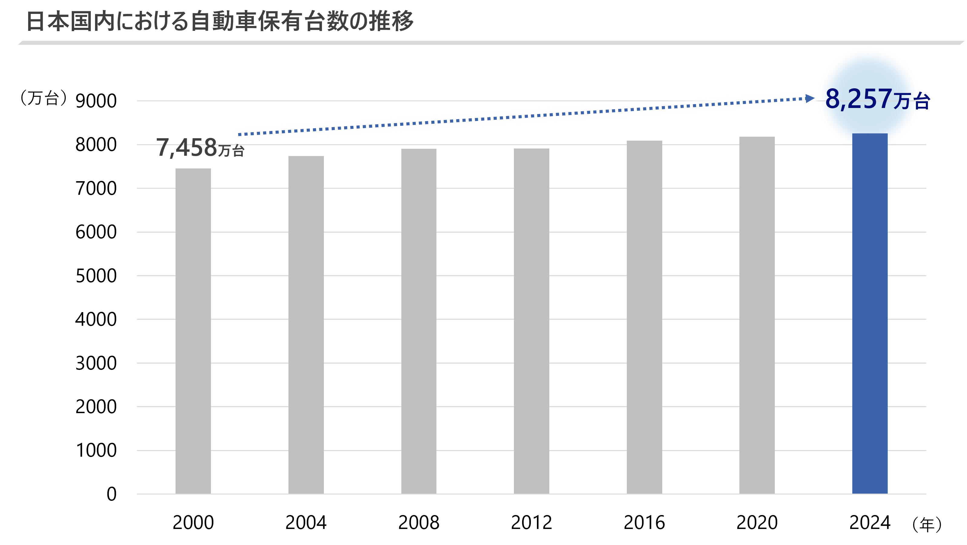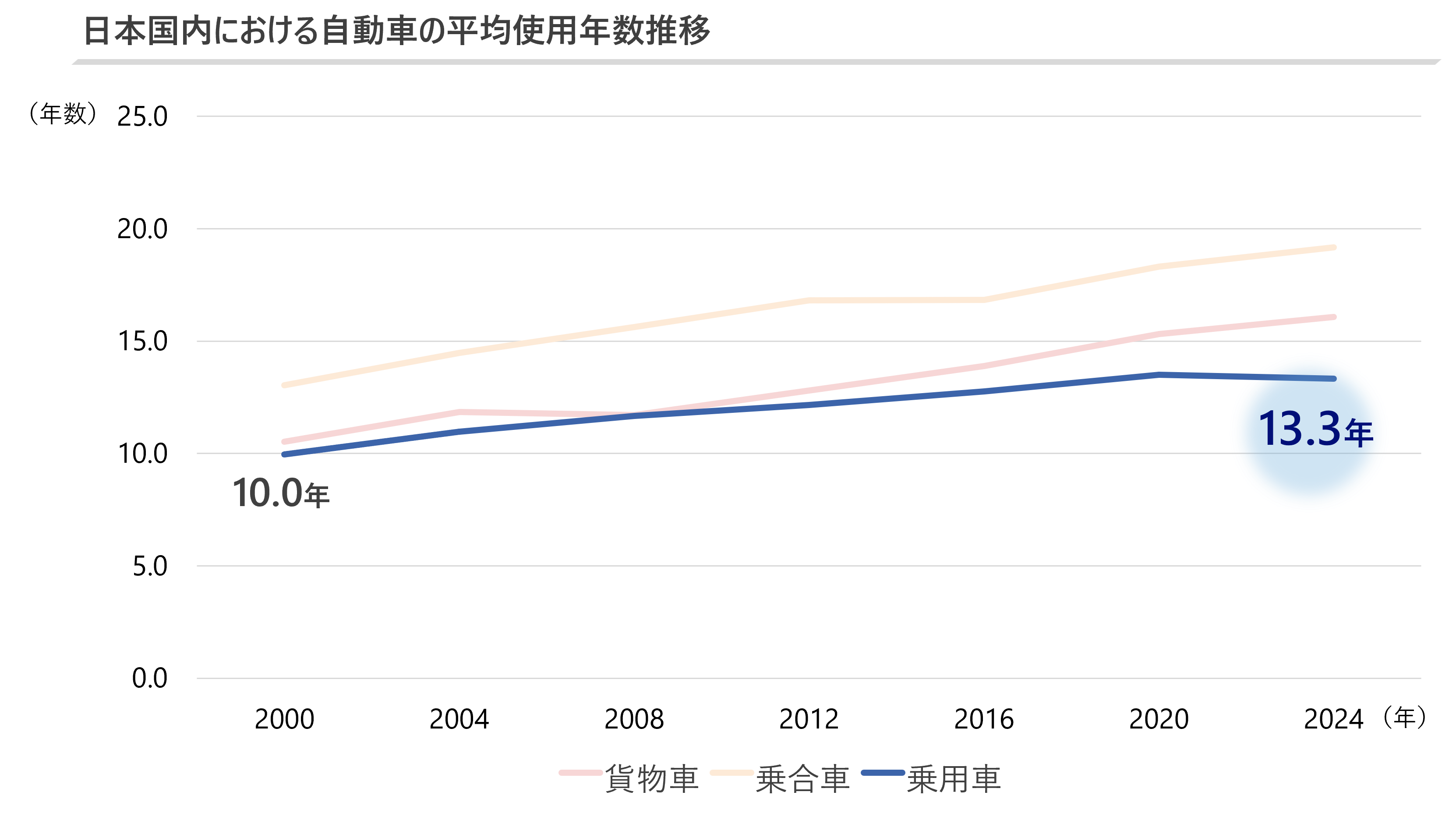 また、日本国内における自動車保有台数は増加傾向にあり、乗用車の平均使用年数は2000年の10.0年から2024年には13.3年へと伸びています。この2つの傾向は、今後の整備需要の継続を示唆しています。