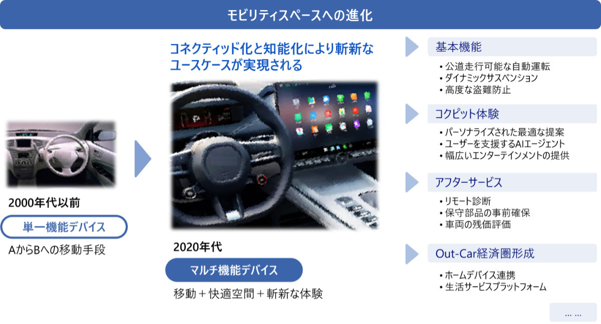 自動車産業は今、100年に1度の大変革期を迎えています。携帯電話がスマートフォンへと進化したように、これまで単なる移動手段だったクルマは、デジタル技術との融合によって「マルチ機能デバイス」、さらには「新たなモビリティスペース」として大きく進化しようとしています。クルマと、様々なIoT(Internet of Things)デバイスやサービスプロバイダーが連携することによって、ユーザーに対して快適な空間と斬新な体験の提供が可能になります。先行市場では、高度にデジタル化されたクルマが、ユーザーから選ばれるための必須条件になりつつあります。さらに、このようなユーザーニーズの変化は先行市場に留まらず、グローバル市場にも広がっていくことが予想されます。
