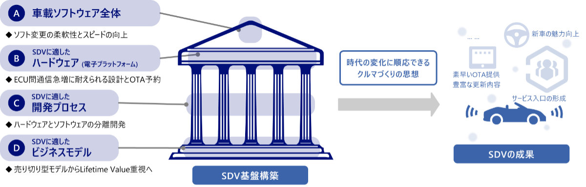 ただし、重要なのは「どのような機能を実装するのか」という表層的な問題ではありません。予算、時間、コスト、特許などの現実的な要素を無視すれば、伝統自動車メーカーは、新興自動車メーカーが実現済みの機能を自社ブランドのクルマに実装することは可能です。重視すべきは、「リリースできたものの、市場のニーズが変わってしまっていた」「技術が予想以上に速く、自社製品が時代遅れになってしまった」とならないような、変化に対する順応性をいかにクルマに「実装」するかです。変化し続ける時代に追従できるクルマを、如何に速く、如何にリーズナブルに作るのかという、いわば古くから追求されてきたことを、デジタル化の観点でどう再考し、どう実現すべきかがポイントになります。