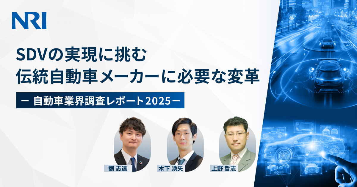 野村総合研究所システムコンサルティング事業本部の劉です。自動車領域の中でも、特にソフトウェアを専門としたコンサルティング活動を行っています。昨今、次世代車両として話題になっているSDV(Software Defined Vehicle)について、市場トレンドやユーザーニーズの変化をお話しした後、SDVを実現するために伝統自動車メーカーがとるべき対策について解説します。