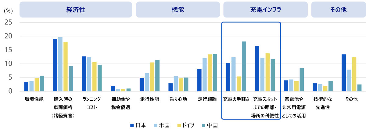 先ほど述べた通り、EVシフトを進めるためには、充電インフラの整備が不可欠です。NRIが実施した消費者アンケートの結果を見ると、EVを購入したくない理由として、車両価格やランニングコストの高さに次いで、「充電スポットの距離・場所の利便性」と「充電の手軽さ」が挙げられています。この結果は、消費者がEV購入を検討する際に、充電に関する利便性を重要視していることを示しており、充電インフラの整備がEV普及の鍵となることを裏付けています。