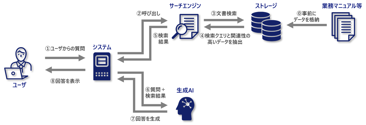 この課題を解決するために、業務マニュアルや過去の問合せ履歴を生成AIに読み込ませたRAG(Retrieval-Augmented-Generation)を構築し、業務効率化の実証実験を実施しました。RAGとは、利用者が生成AIに対して業務に関する質問をすると、生成AIが業務マニュアルなどを参照し、その内容に基づいた回答を生成する仕組みです。一般的な生成AIは、組織固有の情報については学習していないため回答できませんが、このRAG環境により、生成AIに新たに学習させることなく組織固有の質問にも回答できるようになります。