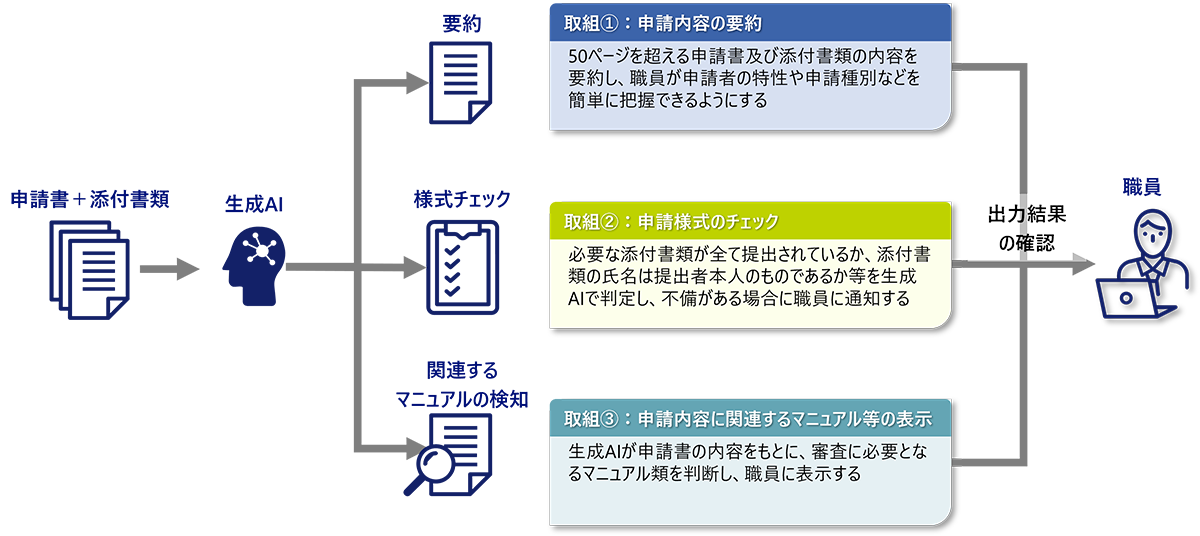 - 申請内容の要約:50ページを超える申請書及び添付書類の内容を要約し、職員が申請者の特性や申請種別などを簡単に把握できるようにする