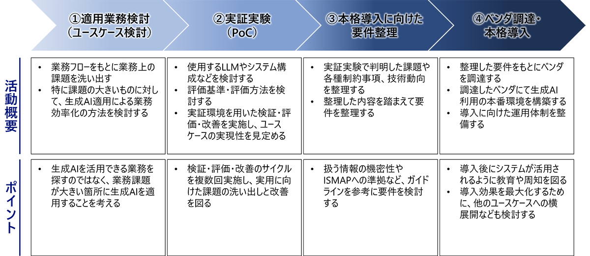 最初のステップとして、どの業務のどのような用途に生成AIを適用するのかを見定めるための「適用業務の検討(ユースケース検討)」を行うことが一般的です。この際、生成AIを適用できる部分を闇雲に探すのではなく、業務課題を軸にユースケースを選定することが重要です。具体的には、業務フローをもとに業務課題を洗い出し、各課題の大きさを定量化して、優先的に取り組むべきものを選定する進め方をおすすめします。特に官公庁や自治体で生成AIの導入を検討する場合、最終的には費用対効果の説明が必要になるため、ユースケースの選定時から業務に係る時間やミスの発生数などの定量指標を用いながら選定しておくことが望ましいと考えます。また、冒頭で紹介したガイドラインの内容を踏まえ、生成AIで扱える情報の機密性などを考慮し、現実的なユースケースを検討することも必要です。