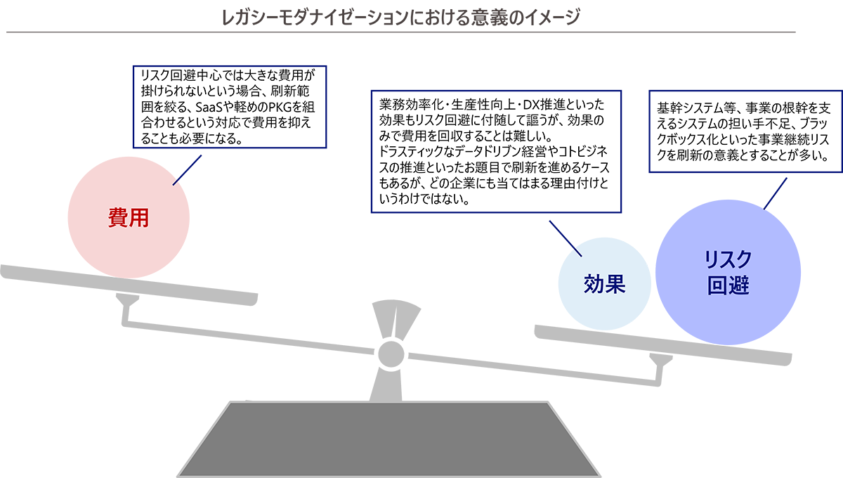 IT投資は一般的に、費用対効果に見合うかどうかで判断されることが多いですが、レガシーモダナイゼーションに関しては、リスク回避が主な目的となります。効果だけでシステム投資額や、それにかかる労力を回収することは難しく、特に会計や人事といったバックオフィスの仕組みでは利用者も限られるため、定量効果での説明が難しくなります。