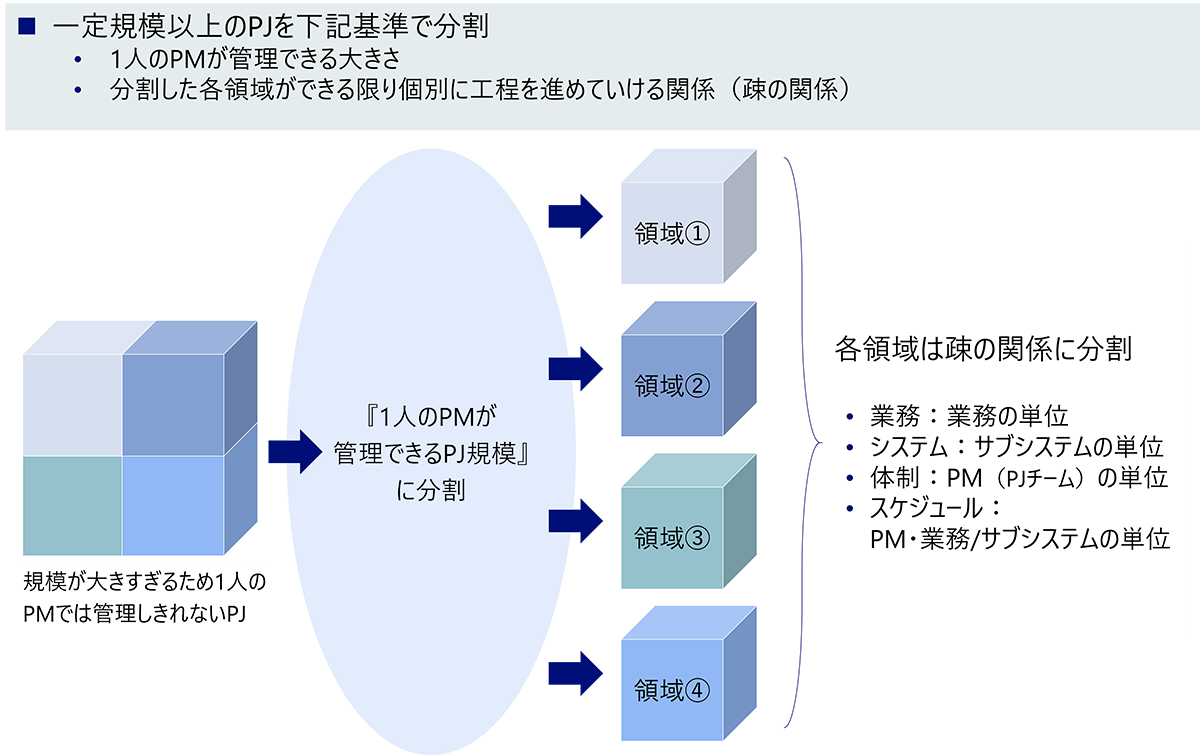 過去の事例を踏まえると、プロジェクトマネージャーが管理できる範囲は、業務単位、サブシステム単位、一定の開発規模といった観点で妥当な規模に設定することで、品質面や進捗面でプロジェクトマネージャーが全体を把握し、適切な管理を行うことが可能となります。また、分割した複数領域を同時並行で進めることで、前述のプロジェクト長期化リスクの回避や、効果の早期刈り取りにもつながります。