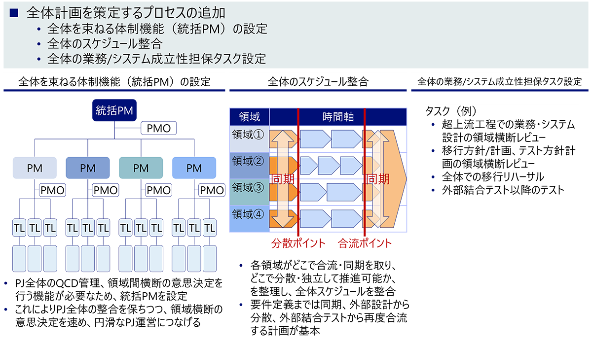 また、タスクやスケジュールの設定として、各領域がどこで合流し、どこで分散・独立して推進可能かを整理し、全体スケジュールとして整合性を図っておく必要があります。さらに、全体の業務やシステムの成立性を担保するタスク(要件定義後のウォークスルー、全体移行方針や計画、全体テスト方針や計画など)を設定し、領域間で中身の整合性を図っていくことが重要になります。