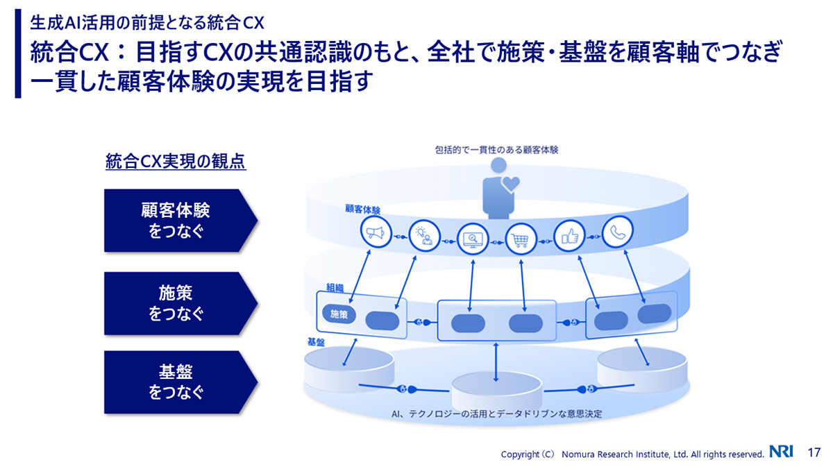 NRIは、『生成AI時代を勝ち抜く顧客接点変革 ~組織横断で体験を”つなぐ”実践的アプローチ~』と題したウェビナーを開催。「顧客体験・施策・基盤」の3つを有機的につなぎ、全社統合型のCX(統合CX)を実現するための実践論を解説しました。