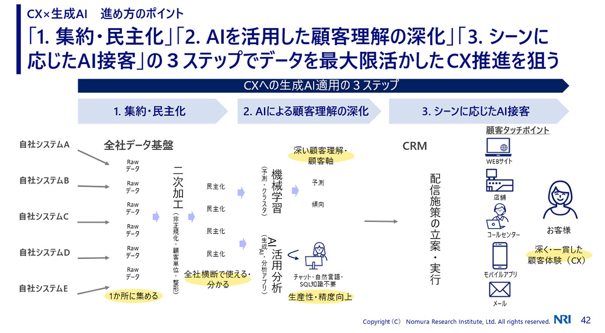• 3.基盤をつなぐ:顧客IDやデータを統合し、AIが顧客のコンテキストを正しく理解できる環境(AI Readyなデータ基盤)を作る。