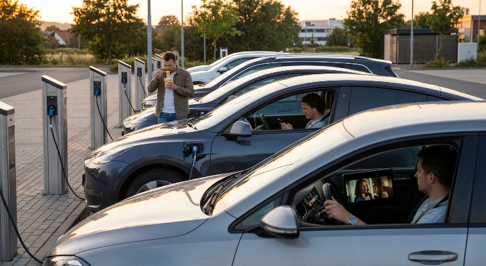 周りを見渡すと、充電や換電を待っているドライバーたちは、車内の大型スクリーンで動画を見たり、スマホを操作したり、各々の時間を過ごしています。どのドライバーも充電時間を苦痛に思う様子はなく、EV利用の足かせとなるような「利用のしにくさ」は一切感じられませんでした。