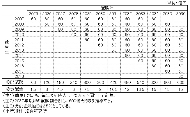 具体的に誰にどう配賦するのか。例えば、毎年の新成人に対して、成人を迎えた年から10年間にわたって配賦するのが良いのではないか。つまり、18歳~27歳までの間、ETFを毎年少しずつ受け取るのである。新成人を対象とする部分は大崎(2021)による提案と同じだが、筆者はさらに、「10年間の積立配賦」を付け加えたい。一生に一度だけ(新成人を迎えた年にだけ)受け取るよりは、複数回にわたって受け取るほうが効果は高いと考えるからだ。