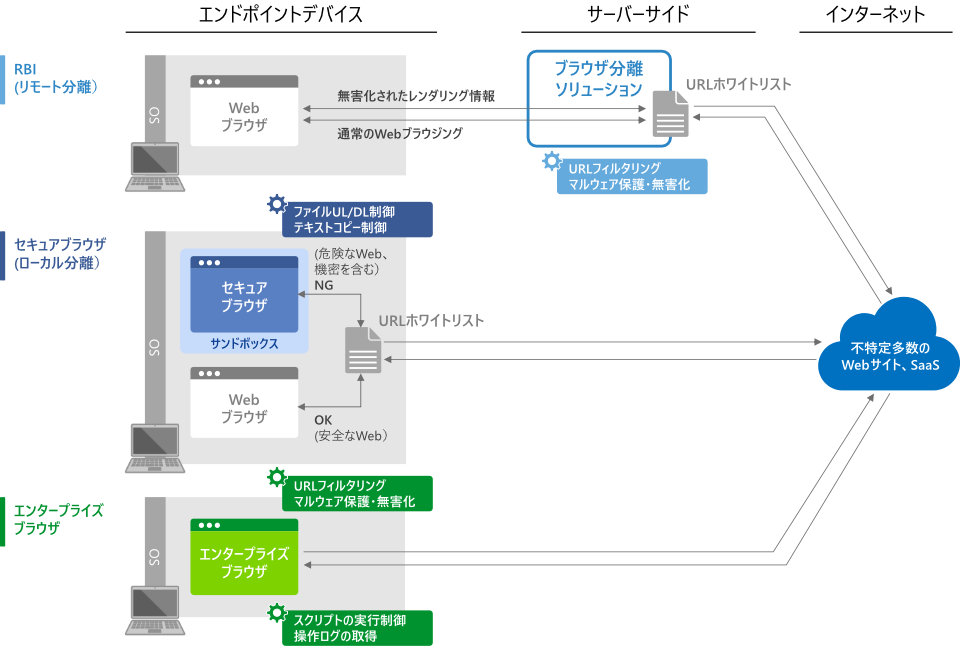 従来、Webブラウザに対するセキュリティ対策としてはセキュアブラウザの利用が一般的でしたが、独自レンダリングや無害化に伴い正常に表示されないサイトがある、セキュアブラウザ利用対象外とするサイトリスト(ホワイトリスト)の管理が煩雑でかつ対象外となったサイトに対するセキュリティ対策が行えないなどの課題がありました。