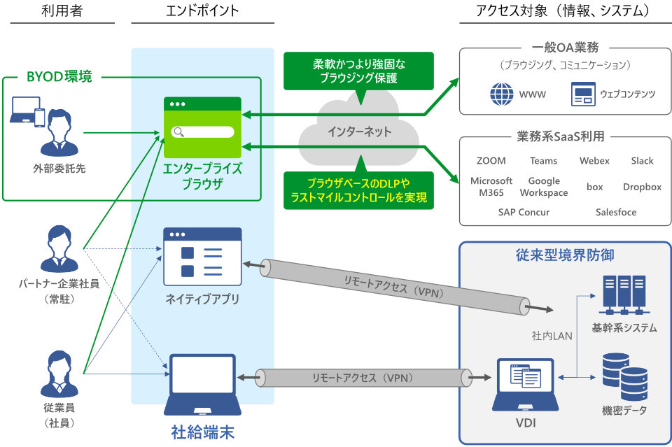 利用例としては、社内機密情報など、環境分離が必須要件となるリソースへのアクセスやネイティブアプリを利用する業務には引き続きVDIを採用し、一般OA業務向けには、セキュアブラウザの代替や一部ユーザ向けVDIの代替としてエンタープライズブラウザを採用する、という組み合わせと使い分けが想定されます。また、将来的には外部委託先や自社の従業員に対し自社端末の貸与を止め、BYOD活用が進む可能性も考えられます。
