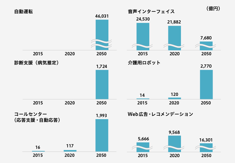 そして、何と言ってもこれから拡大が期待されるのは、車の自動運転です。世界的に高齢化が進む中で、研究開発も積極的に進められおり、トヨタ自動車がシリコンバレーに研究所を設立するなど日本企業の動きも加速しています。2050年には、全ての自動車に人工知能が搭載され、自動車分野が人工知能の最大市場になっている可能性は高いです。